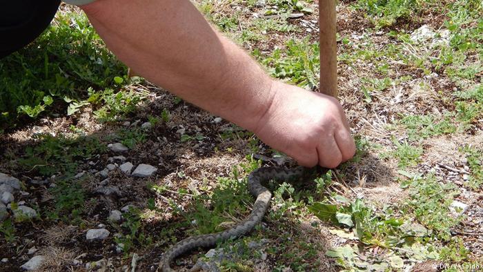 Док је у великој, избушеној пластичној боци већ чувао два ухваћена поскока, са својим братом Недјељком за Deutsche Welle демонстрира хватање трећег.