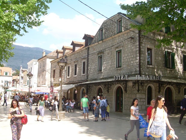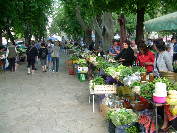 A pijaca, takođe pod platanima, čarobno je i jedno od najživopisnijih mesta u gradu na Trebišnjici. Subotom i sredom, kada su pazarni dani, na njoj od ranog jutra - kao u košnici. Tezge pune čuvenih domaćih hercegovačkih proizvoda: sireva iz meha, u grudi, u koturu i ulju, pršuta, slanine, pečenice, smokava, kupusa raštana, nevesinjskog i gatačkog kajmaka iz mešine, vina, loze, meda, lekovitog bilja, suve ribe u maslinovom ulju...