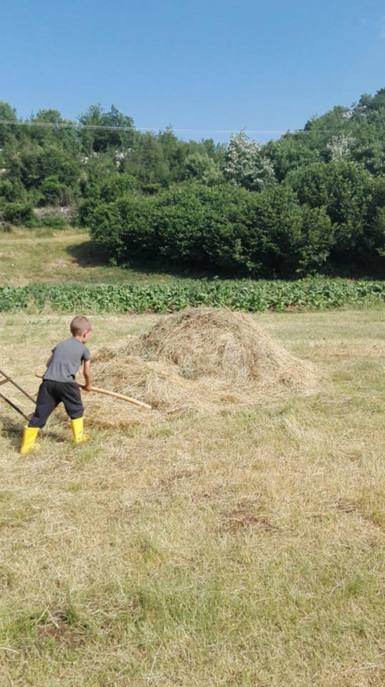 - Plastimo seno. To je obavezno. Imamo nekoliko livada gde je seno pokošeno. Mesec dana idemo da ga prevrćemo sa vilama da se osuši, a ako nas posluži sreća i ne padne kiša onda ga baliramo. To jeste malo teže, ali iz Trebinja dođe moj drugar Miloš koji ima isto godina kao i ja i zajedno to radimo. Pomogne on meni, pa onda pomognem i ja njemu. Čim se sve to završi, onda imamo vremena da igramo i fudbal na livadi. Najlepše mi je kada skupljamo drva jer tada ceo dan jašem konje. Jedino mi je krivo što je put loš, pa bih voleo da nam neko pomogne i napravi put jer ovde je sve zdravo i više ljudi bi dolazilo i mnogo mojih drugara bih doveo iz Beograda da vide kako ovde živi moja familija. Došli smo na jedan dan ali ja sad ne idem nikuda odavde - poručio je Uroš.