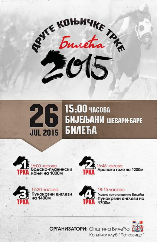 Opština Bileća i Konjički klub “Potkovica” Bileća, drugi put organizuju konjičke trke, u Bileći, na lokaciji Bijeljani-Ševari Bare, pored magistralnog puta Bileća-Berkovići.