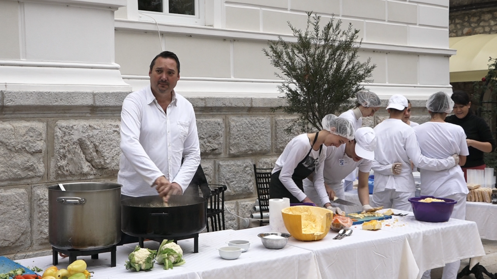 Kuvar Nihad Mamaledžija je sa učenicima ugostiteljske škole iz Trebinja pripremao nekoliko italijanskih jela i dezert, koji su hercegovačke proizvode spojili sa mediteranskom kuhinjom. Kako je istakao Memaledžija, to je suština italijanske kuhinje – uzeti ono što imate iz podneblja.