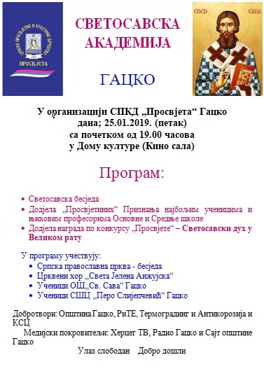 У организацији СПКД „Просвјета“ Гацко, у петак, 25. јануара са почетком од 19.00 часова, у Дому културе у Гацку биће уприличена Светосавска академија.