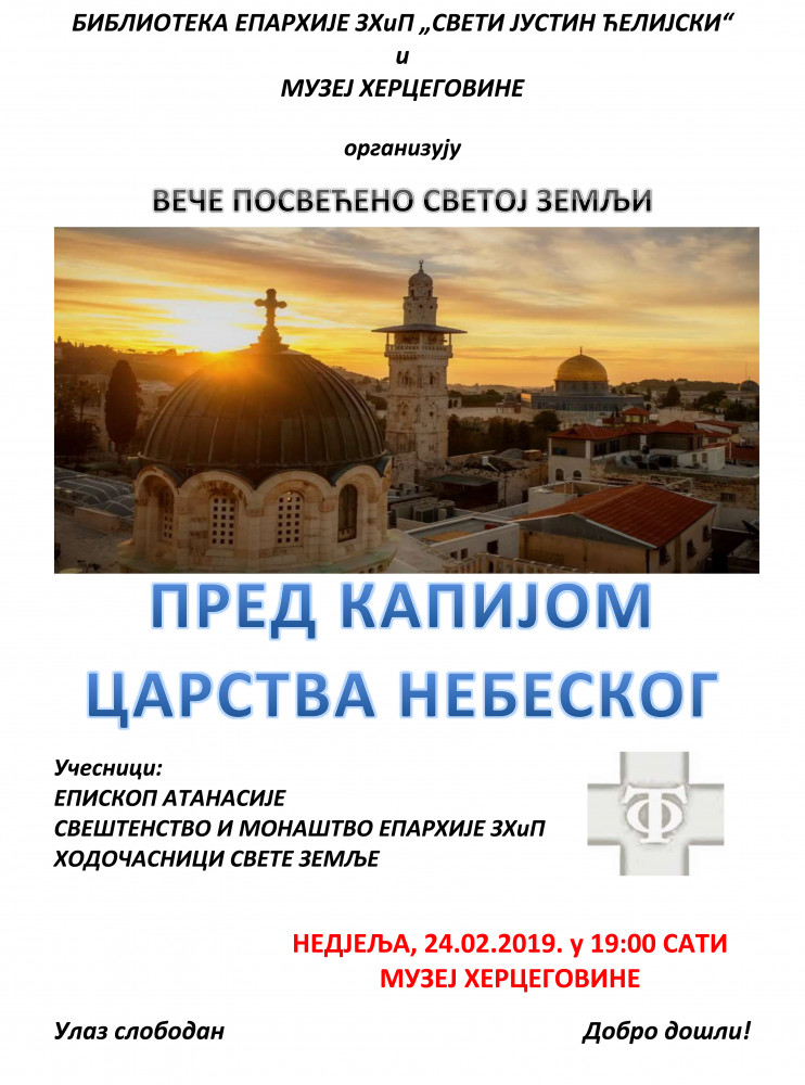 У Музеју Херцеговине Требиње вечерас ће бити одржано вече посвећено Светој земљи, под називом „Пред капијом царства небеског“.
