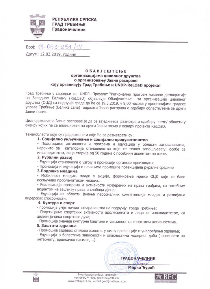 Grad Trebinje, u saradnji sa UNDP -Projekat "Regionalni program lokalne demokratije na Zapadnom Balkanu (ReLoaD)", obavještava organizacije civilnog društva sa područja grada da će se sutra, 19. marta održati Javna rasprava o odabiru oblasti/ tema za drugi Javni poziv za ovaj projekat.