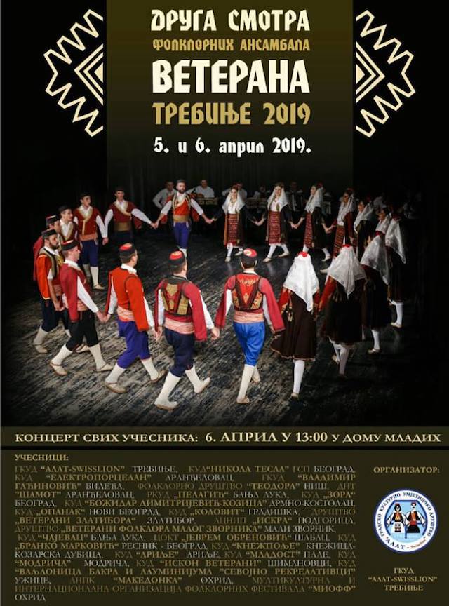 U organizaciji Gradskog kulturno-umjetničkog društva "Alat Swisslion" iz Trebinje 5. i 6. aprila u Domu mladih će se održati "Druga smotra folklornih ansambala veterana Trebinje 2019".