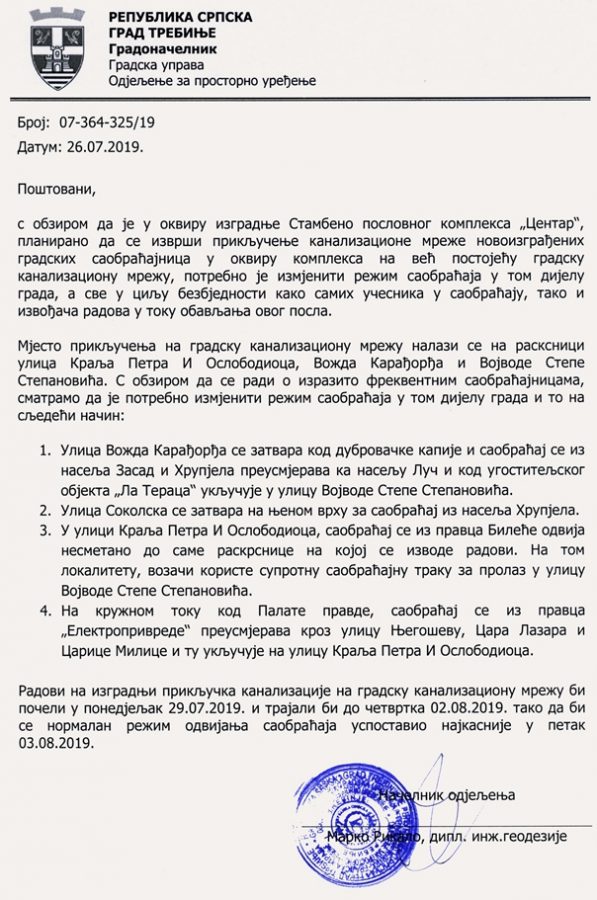 У центру града наредне седмице биће измијењен режим саобраћаја због радова на изградњи канализационих прикључака стамбено-пословног комплекса „Центар“ на градску канализациону мрежу, који ће бити извођени на раскрсници између улица Краља Петра Првог Ослободиоца, Вожда Карађорђа и Војводе Степе Степановића.