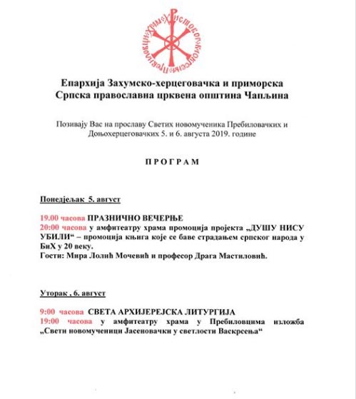 Eparhija Zahumsko-hercegovačka i primorska 5. i 6. avgusta, proslavlja praznik Svetih novomučenika Prebilovačkih i Donjohercegovačkih.