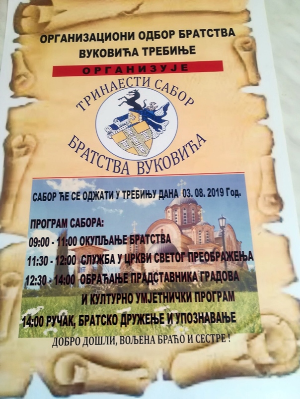 Organizacioni odbor bratstva Vukovića organizuje sutra u Trebinju trinaesti sabor bratstva Vukovića.