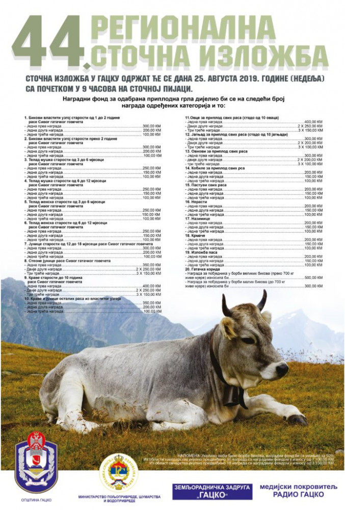 У недјељу, 25. августа, на сточној пијаци у Гацку са почетком у 9:00 часова, одржаће се 44. по реду Регионална сточна изложба приплодних грла говеда, оваца, свиња, коња, као и Гатачка корида и изложба паса.
