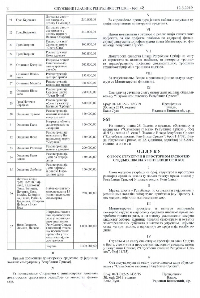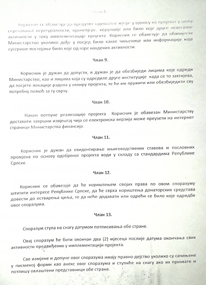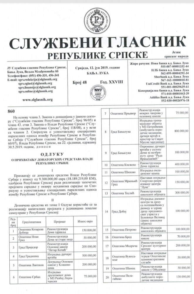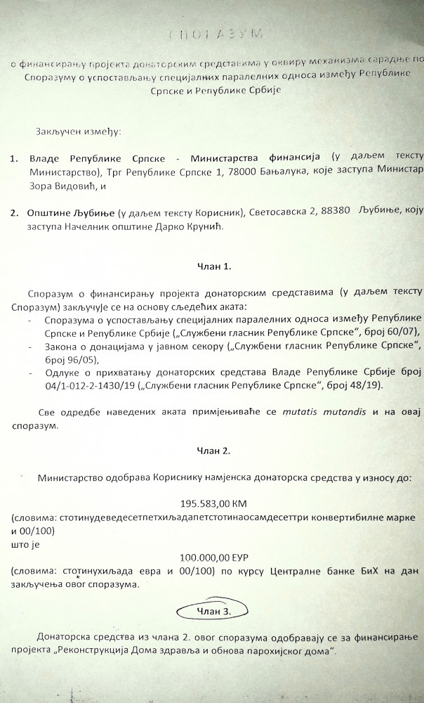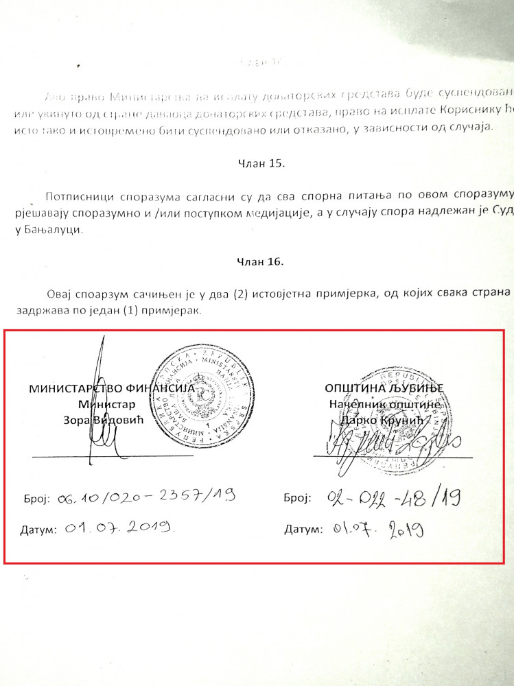Свјесни смо да на ова наша питања немате или имате лаж као одговор али нас чуди како имате образа и даље лагати и обмањивати своје комшије и суграђане ?! Видимо да су предсједници МЗ Виногради лојалност према општинском руководству и вјерно служење Перси Клименти донијели корист у виду асфалтиране улице која , напомињемо, није излазна и није приоритет у насељу. Међутим чуди нас чињеница да мислите да ће мјештани Винограда и даље слијепо вјеровати вашим празним обећањима. Сматрамо да смо дужни разјаснити и ситуацију око донације Владе Србије општини Љубиње. Начелник је још једном показао и доказао своје незнање и недораслост функцији коју обавља. Љубињци требају знати да је кандидовао пројекат који представља путну инфраструктуру која уопште није обухваћена програмом донације. У Одлуци о прихватању донаторских средстава Србије коју је на сједници  Владе РС одржаној 30.5.2019. по којој су подијељена донирана средства јасно се види да ниједна општина није добила новац за изградњу путне инфраструктуре. Начелник се приликом кандидовања пројекта није ни са ким консултовао нити се информисао о програму донације. Сматрамо да је тиме нанио штету Љубињу. Сва срећа је да су људи из Владе РС контактирали руководство и препознали проблеме ЈУ „Дом здравља“ Љубиње јер би у супротном били у ситуацији да наша средства добије нека друга општина. Још увијек нам није јасно због чега је начелнику проблем донација здравственој установи чији су корисници сви Љубињци?! Срамота нас је једини начелник у Републици Српској који се није захвалио грађанима и властима Републике Србије на вриједном поклону. У прилогу саопштења као доказ нашим наводима налази се Одлука Владе РС и у њој се јасно виде пројекти који су били обухваћени донацијом а то су  санитетска возила, реконструкције школа и вртића, здравствених установа, спортске дворане, установе социјалног карактера итд. Новац за путну инфраструктуру није добила ниједна општина у Републици Српској. Становници Љубиња требају знати да је наш начелник 1.7.2019. отишао у Бањалуку и са министром финансија у Влади РС госпођом Зором Видовић потписао споразум о финансирању пројекта донаторским средствима. Том приликом прихватио је донацију у износу од 195 583 КМ за реализацију два пројекта и потписом се обавезао у име Општине да ће реализовати пројекат реконструкције дома здравља и изградње парохијског дома. Споразум се такође, као доказ нашим тврдњама , налази у прилогу саопштења. Скоро три мјесеца од дана када је донесена Одлука Владе РС и непуна два мјесеца како је потписао Споразум о реализацији пројекта, начелник је уз помоћ пар својих полтрона организовао потписивање петиције у Виноградима. Петицијом  се тражи од СО Љубиње да изгласа захтјев упућен Влади РС како би се донацијска средства од Републике Србије реалоцирала у пројекат Винограда.