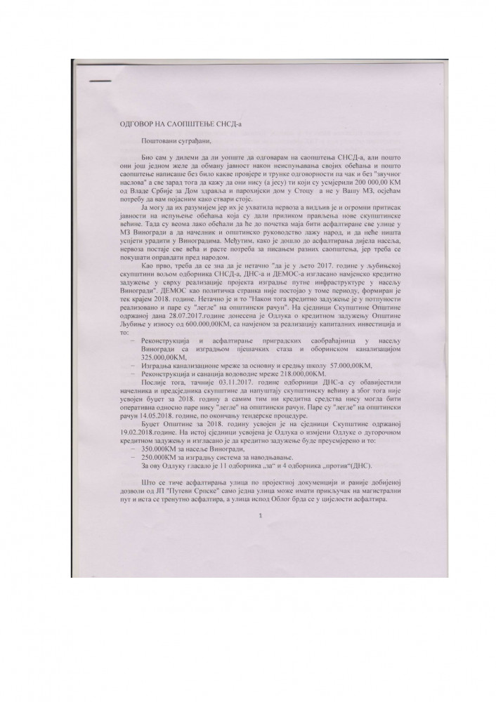 Као прво, треба да се зна да је нетачно "да је у љето 2017. године у љубињској скупштини вољом одборника СНСД-а, ДНС-а и ДЕМОС-а изгласано намјенско кредитно задужење у сврху реализације пројекта изградње путне инфраструктуре у насељу Виногради". ДЕМОС као политичка странка није постојао у томе периоду, формиран је тек крајем 2018. године. Нетачно је и то "Након тога кредитно задужење је у потпуности реализовано и паре су "легле" на општински рачун". На сједници Скупштине Општине одржаној дана 28.07.2017.године донесена је Одлука о кредитном задужењу Општине Љубиње у износу од 600.000,00КМ, са намјеном за реализацију капиталних инвестиција и то: