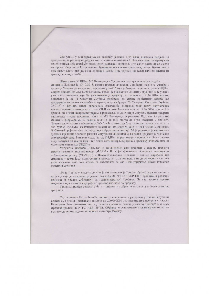 Општина Љубиње је 10.12.2015. године послала апликацију на јавни позив за учешће у пројекту "Јачање улоге мјесних заједница у БиХ " који је био расписан од стране УНДП-а. Својим писмом, од 21.04.2016. године, УНДП је обавјестио Општину Љубиње да је ушла у ужи избор општина које ће учествовати у пројекту, а писмом од 30.06.2016. године потврђено је да је Општина Љубиње одобрена од стране пројектног одбора као придружена општина са пробним периодом до фебруара 2017.године. Општина Љубиње 22.07.2016. године, након спроведене евалуације доставља ранг листу партнерских мјесних заједница што је од стране УНДП-а потврђено писмом од 17.08.2016.године. По правилима УНДП-за вријеме трајања Пројекта (2016-2019) није могуће мијењати изабране партнерске мјесне заједнице. Како је МЗ Виногради формирана Одлуком Скупштине Општине фебруара 2017. године видимо да није могла да буде изабрана у пројекту "Јачање улоге мјесних заједница у БиХ " већ то може да буде само дио нечије маште и то оне ружне, чупајући из контекста ријечи од 100.000КМ које УНДП улаже у општину Љубиње (4 пројекта мјесних заједница и Друштвени центар). Моје ријечи да је формирање мјесних заједница добро из разлога могућности аплицирања на разне пројекте су чигледно злоупотријебљене. Никаква средства од УНДП-а за реализацију пројекта у Виноградима нису добијена па самим тим нису могла бити ни преусмјерена Удружењу пчелара, што се може провјерити код УНДП-а.