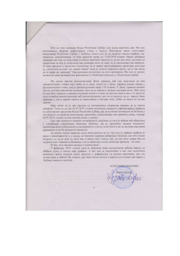 Све горе поменуто можемо поткријепити доказима од чега је већина већ објављена у службеним гласницима Општине Љубиње. Да је приликом писања поменутог саопштења било озбиљности и одговорности и жеље за истином а не за звучним насловом вјероватно га не би никада ни написали.
