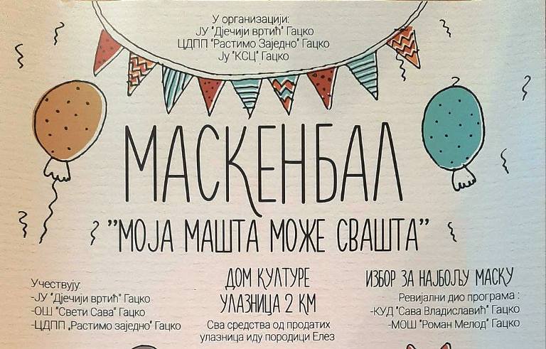 JU „Dječiji vrtić“ Gacko, CDPP „Rastimo zajedno“ i JU „Kulturno-sportski centar“ Gacko, u petak 25. oktobra, u Domu kulture sa početkom u 19 časova, organizuju dječiji maskenbal humanitarnog karaktera.