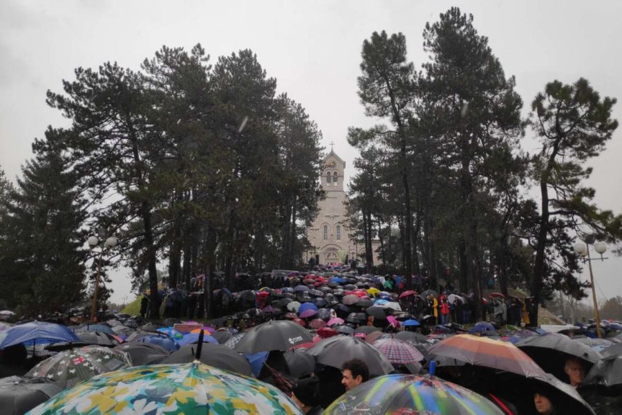 Kroz kišu i maglu smo doputovali u Nikšić, tačno prema planu, u 8:00 časova. Na svakom od „skverova“ stajala je policija: zaustavljamo se tamo gdje znamo da bi trebalo skrenuti lijevo ka Crkvi Svetog Vasilija Ostroškog, a koji je očigledno zatvoren za saobraćaj.