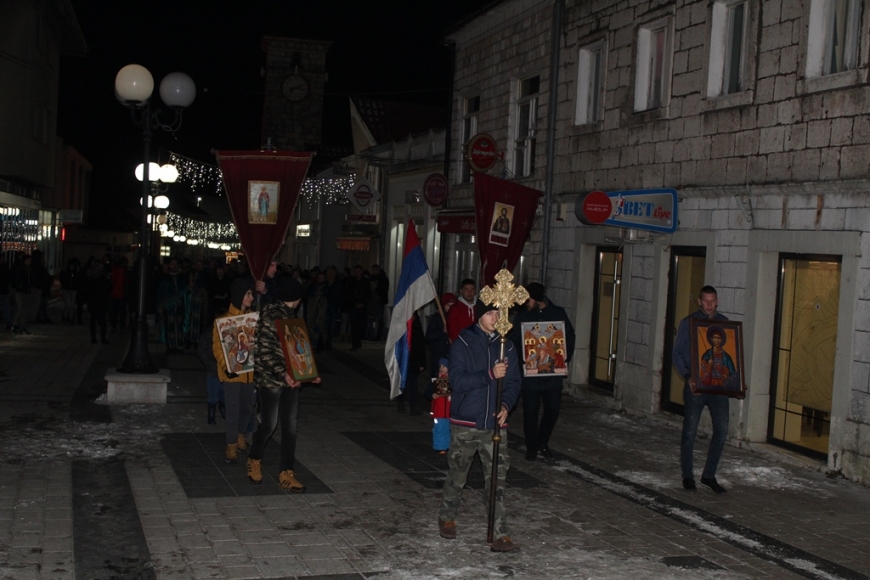 Večernju službu sa molebanom u Sabornom hramu služili su mjesni sveštenici, a nakon toga litija je prošla gradskim ulicama. Skupu na Trgu slobode prisustvovao je veliki broj građana, koji su svojim prisutvom dali podršku braći i sestrama u Crnoj Gori, koji brane najveće srpske svetinje.