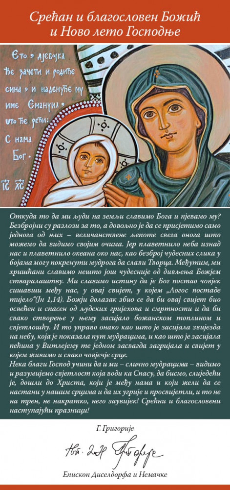 “Mir Božiji, Hristos se rodi. Slava na visinu Bogu i na zemlji mir među ljudima i dobra volja. Ovo su poruke od anđela i pastira i ovo je pozrav kojim se pozdravljamo mi pravoslavni Srbi, hrišćani, ma gdje da živimo na ovom svijetu. Ovim pozdravom, ovaj put želim da pozdravim vas, pravoslavne hrišćane koji živite u NJemačkoj. Svi smo mi Hrišćani i to što smo Hrišćani obavezuje nas da se uvijek sjećamo ovih poruka i prenosimo radost koju nam donosi rođenje Hristovo. Rođenje Hristovo dogodilo se radi nas i radi našeg spasenja. Dogodilo se na čudesan način, najskromniji mogući način. Hristos, Bog koji je širi od nebesa, sišao je u svijet i postao jedan od nas- postao je čovjek da bismo mi ljudi, po riječima najvećih učitelja Crkve, mogli da postanemo Bogovi to jest mogli da živimo vječno. U danima u kojima mi danas živimo, u ovom svijetu koji je pun smutnji, kao što je uvijek u svijetu bilo smutnji, potrebno je da dođemo u svoje crkve, da dođemo pred lice Hristovo, da se vratimo toj njegovoj ljubavi, koja je neizmjerna, neizreciva i neporeciva. On, koji je radi nas ljudi postao jedan od nas, koji je umro za nas i koji je vaskrsao radi nas i radi našeg spasenja, nikad nas ne ostavlja i uvijek nas prihvata“, naveo je vladika Grigrorije u svojoj poruci.