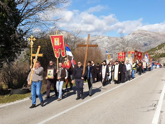 Неколико хиљада вјерника из свих дјелова Херцеговине кренуло је у литији из Мркоњића, родног села Светог Василија Острошког, према Требињу са циљем да пруже подршку браћи у Црној Гори.