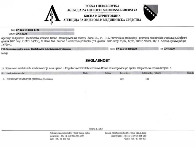 Da li je firma "Srebrena malina" iz Srebrenice imala potrebne dozvole za uvoz respiratora iz Kine, zašto je kompanija kojoj je primarna djelatnost prodaja voća dobila ovaj posao, kolike su bile tržišne cijene nabavljene medicinske opreme?