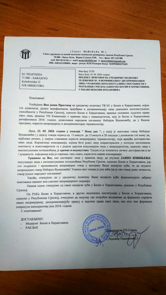 Takođe televiziji N1 ,emisiji NOVI DAN upućen je javni Prigovor u kome se traži javno izvinjenje osobama sa intelektualnim poteškoćama i da ubuduće televizija vodi računa kakav sadržaj emituje. Težina ovog govora je velika pogotovo zato što ga je izgovorila jedna javna ličnost, jedan narodni poslanik.