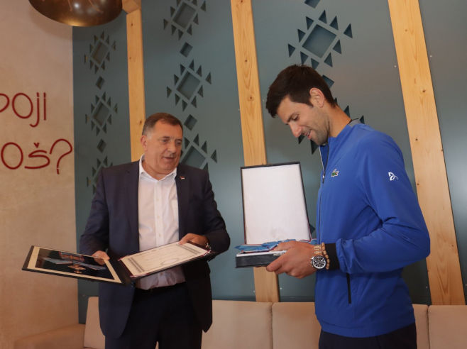 Srpski član Predsjedništva BiH Milorad Dodik uručio je srpskom teniseru Novaku Đokoviću Orden Republike Srpske na lenti za izuzetan doprinos sportu.
