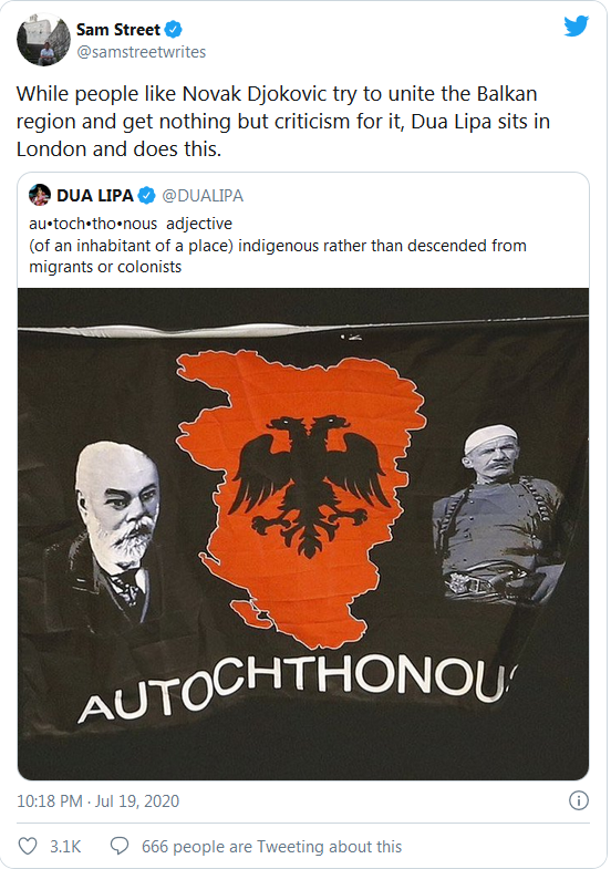 - Док људи као Новак Ђоковић покушавају да уједине Балкан и не добијају за то ништа осим критика, Дуа Липа сједи у Лондону и уради ово - написао је Стрит у одговору Липи. Убрзо је конкретизовао и појаснио због чега је пјевачицин пост споран.
