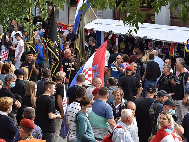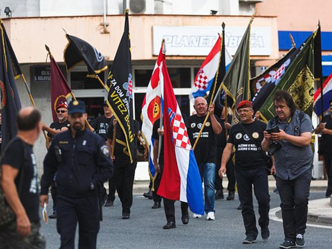 Припадници ХОС-а обучени у црне мајице са грбом у којем је утиснут усташки поклич "За дом спремни!" и уз повике "У бој, у бој" стигли су у Книн, гдје хрватске власти данас обиљежавају 25. година од злочиначке војно-полицијске акције "Олуја".