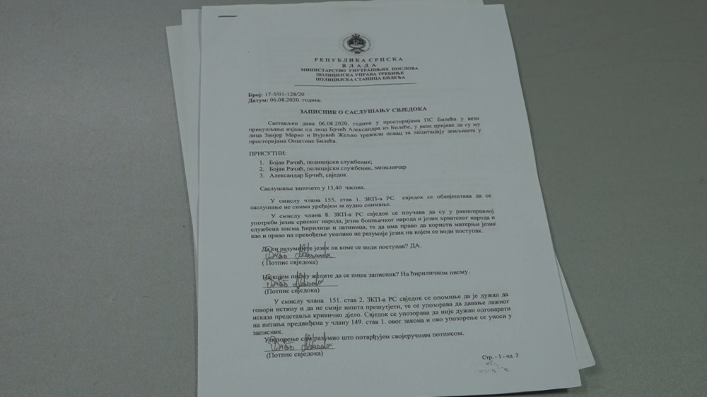O svemu ovome Aleksandar Brčić je obavijestio Policijsku stanicu Bileća o čemu postoji i zapisnik.