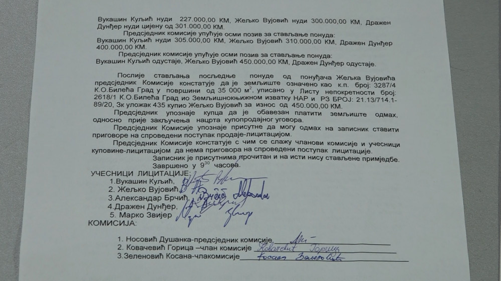 Radenko Popara načelnik Odjeljenja za prostorno uređenje i stambeno-komunalne poslove Opštine Bileća objašnjava da je do ovoga došla pošto Željko Vujović koji je izlicitirao najviši iznos za ponuđeno zemljište od 450.000KM nije sklopio ugovor i uplatio ovaj novac.