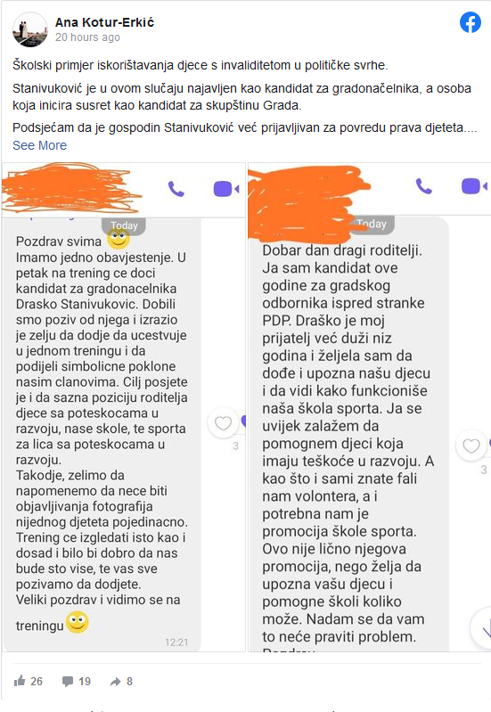 - Djeca s poteškoćama uglavnom ne mogu sama da izraze stav o ovakvim pitanjima i ne treba da ih se pita za politička gostovanja, jer nisu primjerena njihovom uzrastu, zrelosti i mogućnosti učešća. Roditelji, uglavnom, nisu u mogućnosti da se ovakvom političkom lešinarenju suprotstavljaju, jer im je ovo jedan od rijetkih prilagođenih sadržaja za djecu. O političkim opcijama koje imaju - odlučuju na izborima, ne na treninzima za djecu. Pa ni pravni subjekt nije u potpunosti kriv - borba za vjetar u leđa je teška, ali moraju da se ograde od ovakvih manipulacija i da roditelje pitaju za pristanak, a obavijeste - stoji u tekstu.