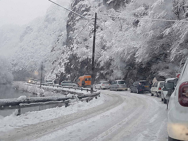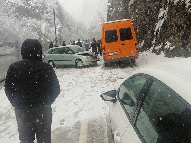 Saobraćaj na ovom putu i prije nezgode bio je otežan zbog ugaženog snijega koji i dalje pada.