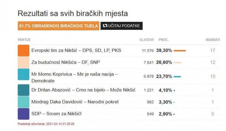 REZULTATI IZBORA U NIKŠIĆU: Obrađeno 61,7 odsto glasova