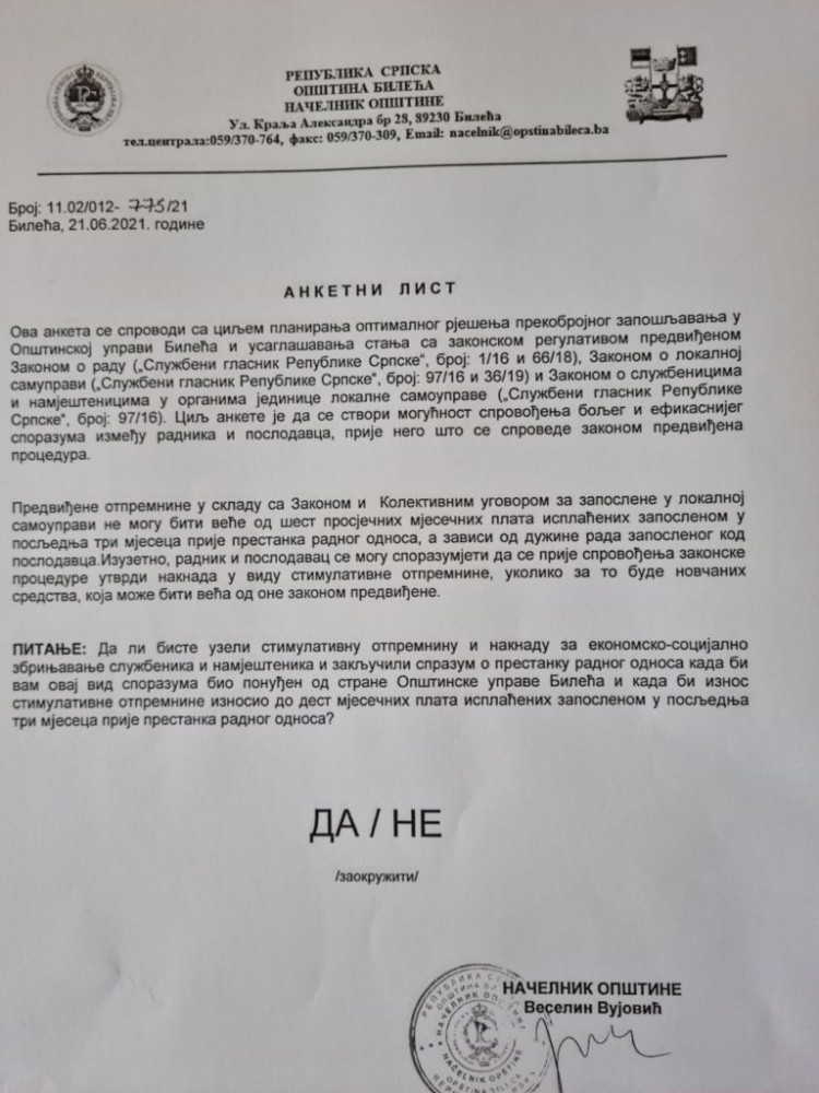 Запосленим у општини Билећа стигао је Анкетни листић који ће показати колико је радника заинтересовано за споразумни прекид односа уз стимулативну отпремнину која ће износити макснимално шест мјесечних плата и то када буде новца .