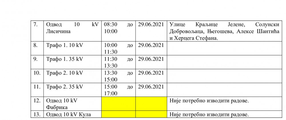 Iako je bilo u planu da remont traje 1 dan, ipak je nemoguće sve odraditi za jedan dan, pa će se radovi izvoditi 28.06 i 29.06.2021.godine po sledećem rasporedu.