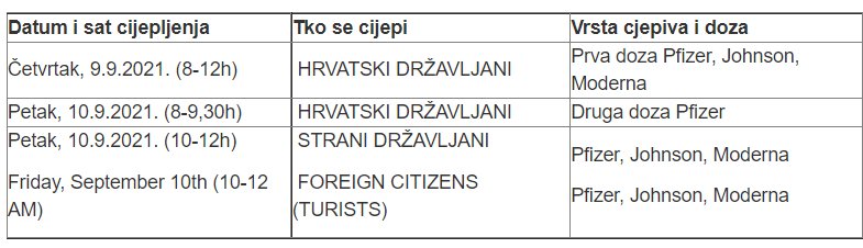 „U petak 10. septembra 2021. u vremenu od 10 do 12 sati mogu se vakcinisati strani državljani cjepivima proizvođača COMIRNATY (Pfizer), Janssen (Johnson&Johnson) te SPIKEVAX (Moderna). Takođe napominjemo svima koji dolaze na cijepljenje da se, zbog visokih temperatura, prikladno obuku, uključujući pokrivala za glavu te da sa sobom ponesu vodu“, navodi se u saopštenju.