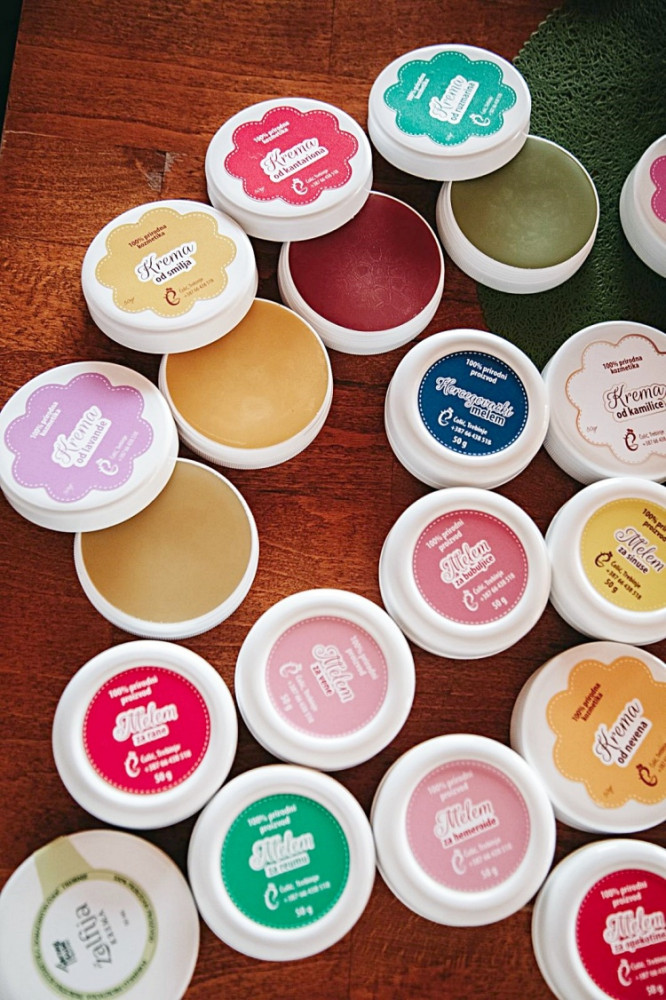 „Počeli smo od 17 proizvoda, a sada ih imamo pedeset. To su razne kreme, melemi, tinkture, ulja i losioni. Riječ je o potpuno prirodnim preparatima. Vosak i ulje su baza - i naravno naše hercegovačke trave. Koristimo nekih petnaestak različitih trava. Od ruzmarina, lavande, žalfije, kamilice, nevena, kantariona, smilja, do hajdučke trave, bokvice, divljeg kestena... I sve je samoniklo bilje. Ništa od sirovina nije plantažno proizvedeno. Kvalitet onog bilja koji uberemo u prirodi, a koje ovdje niče praktično iz kamena - sigurno je mnogo bolji od onog iz plantažnog uzgoja. I sve sami beremo, otac i ja, počevši od naše bašte, dolje do Trebinjske šume, pa uz Leotar...“, ističe Veljko.
