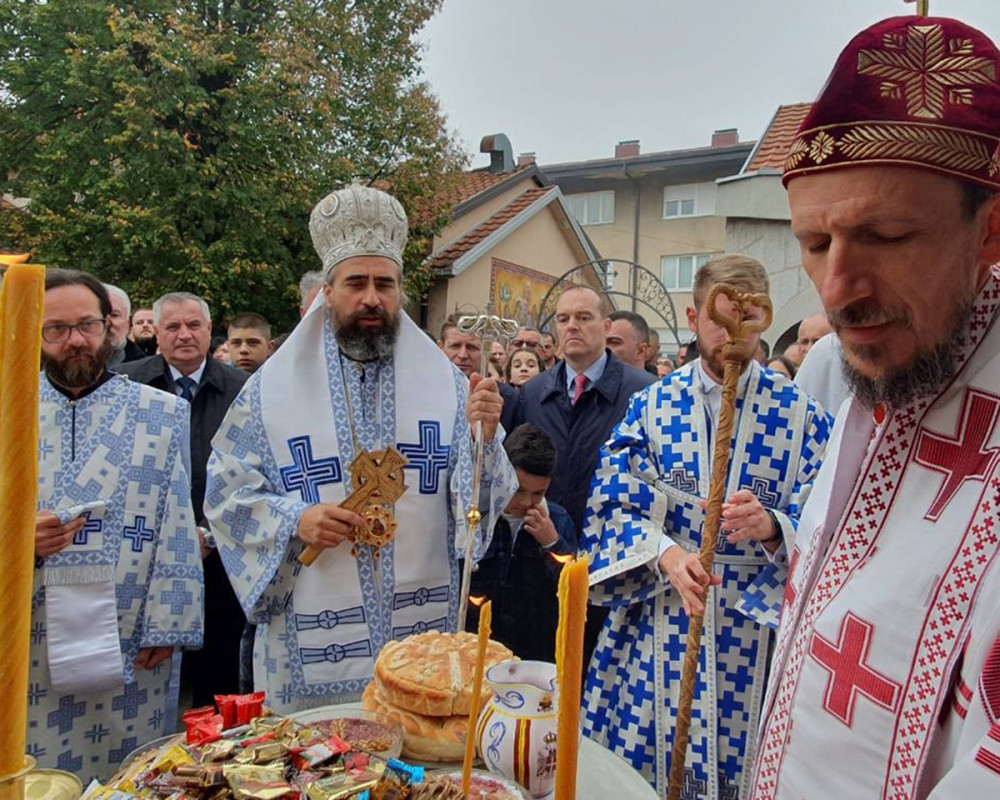 Владика Димитирје данас је испред Саборног Храма Вазнесења Христовог у Невесињу освештао славски колач поводом обиљежавања Митровдана - Дана општине и крсне славе Борачке организације Републике Српске.