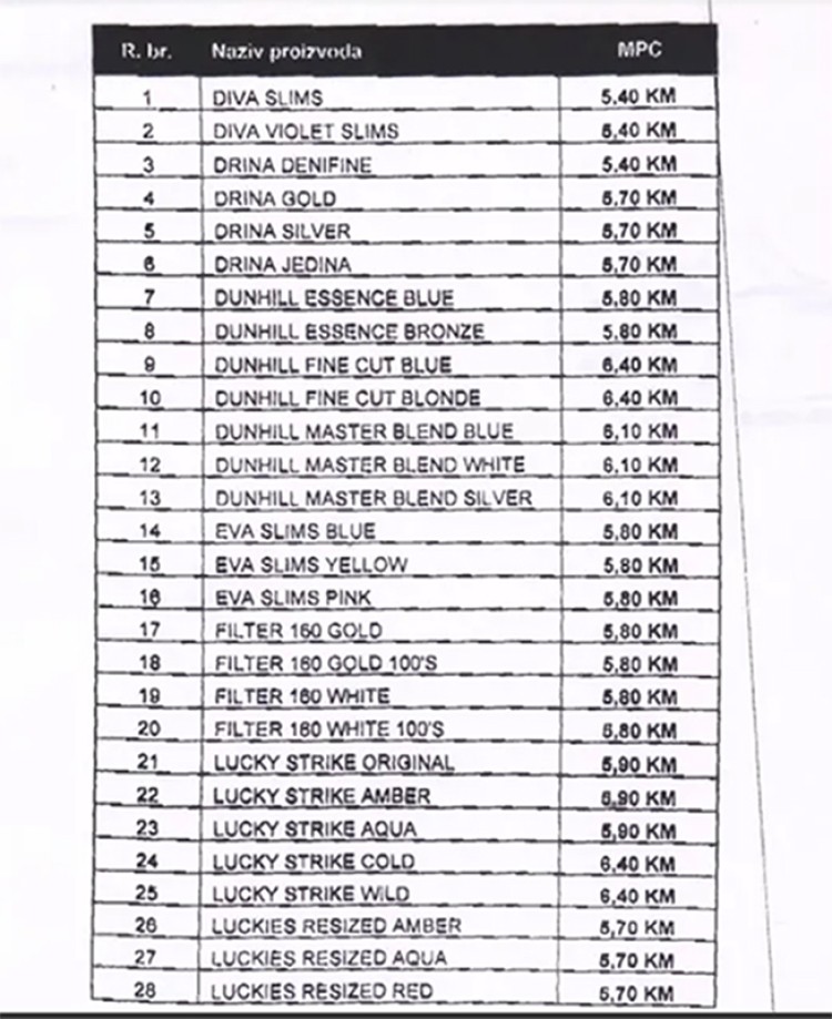 Kako su naveli, nove maloprodajne cijene cigareta koje će biti na snazi od 1. marta UIO BiH je dostavio TDR iz Sarajeva.