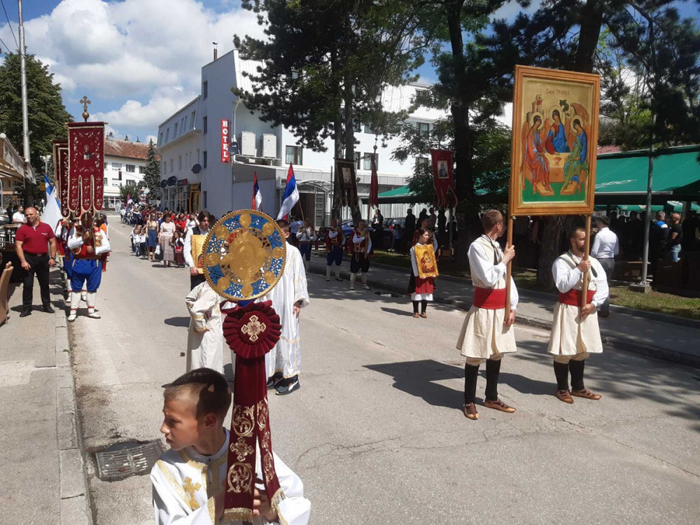 Služenjem Svete liturgije u Hramu Svete Trojice u Gacku, lomljenjem slavskog kolača i svečanom litijom, u Gacku je danas proslavljena krsna slava opštine i hrama - Trojčindan.