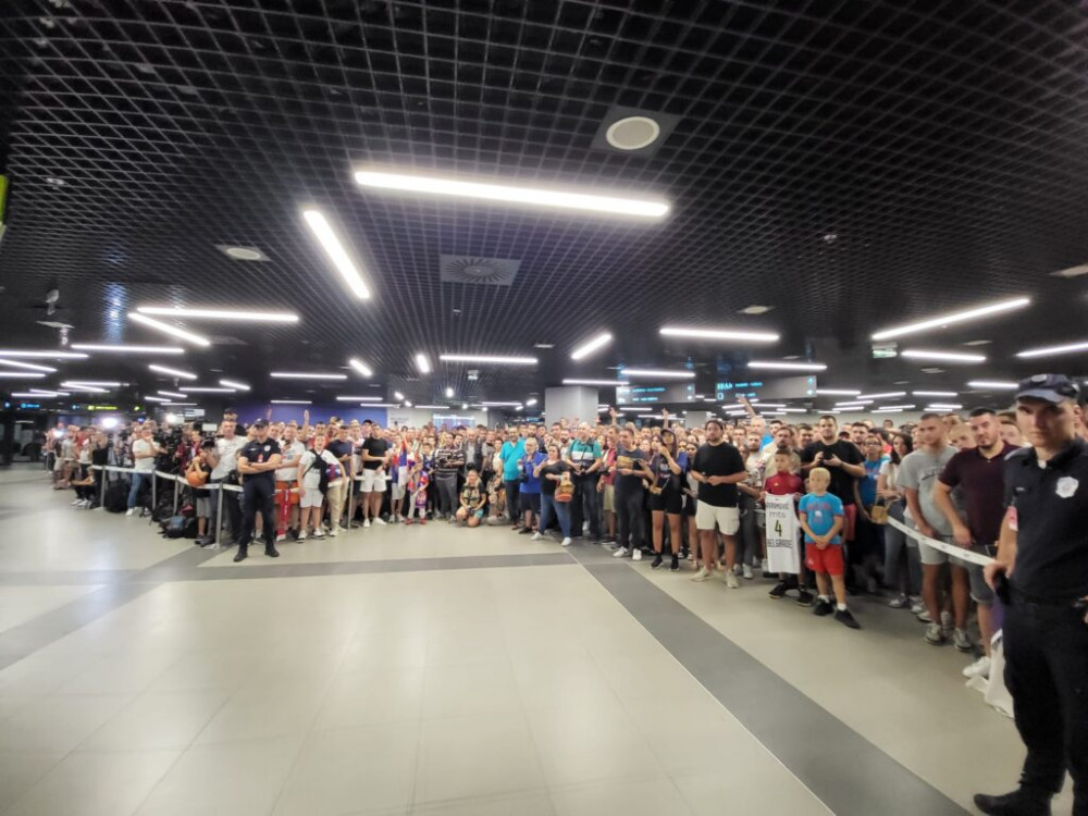 Košarkaše Srbije je na aerodromu dočekalo više stotina navijača, uglavnom mladih. Navijači nose zastave Srbije, a neki su u dresovima nacionalnog tima.