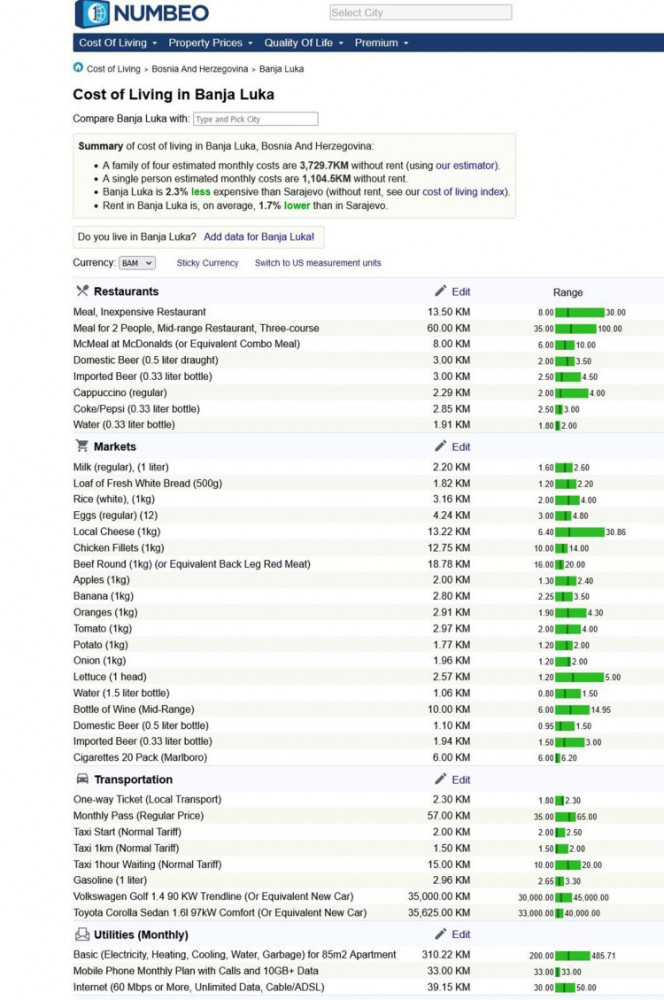 Tako, prema posljednjim ažuriranim podacima, mjesečni troškovi za četvoročlanu porodicu u Sarajevu iznose 3.783 KM, i to, bez najma, a za pojedinca 1.127 KM. U Mostaru su mjesečni troškovi za porodicu u odnosu na Sarajevo jeftiniji za 37 KM, a za pojedinca za 26 KM. U Banjaluci troškovi jedne porodice na mjesečnom nivou iznose 3.729 KM, a pojedinca 1.104 KM.