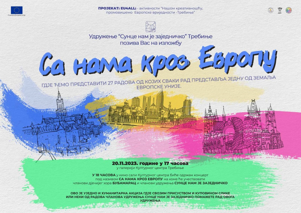 Udruženje „Sunce nam je zajedničko“ Trebinje u ponedjeljak, 20. novembra u galeriji Kulturnog centra organizuje izložbu „Sa nama kroz Evropu“, gdje će predstaviti 27 radova, od kojih svaki rad predstavlja jednu od zemalja Evropske unije.