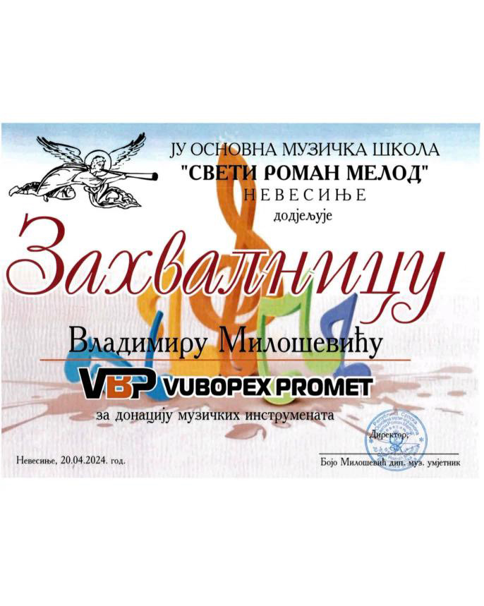 Direktor "VUBOPEX PROMETA doo.", Vladimir Milošević prepoznao je značaj ovakve donacije, jer po njegovim riječima muzičko obrazovanje pruža djeci mnogo više od samog poznavanja muzike, omogućava im razvoj i šire vidike u mnogim sferama života. On je dodao da je donacija instrumenta i dodatne opreme samo mala podrška svim budućim umjetnicima koje će iznedriti ova hercegovačka škola,a kojima će se ponositi kako Hercegovina tako i šire.
