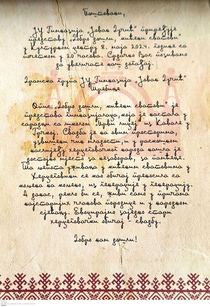 U izvođenju Dramske sekcije Gimnazije "Jovan Dučić" premijerno će biti izvedena predstava " Dobro došli, kićeni svatovi". Predstava, u kojoj će biti prikazana hercegovačka svadba, pripremana je sa mnogo ljubavi, uz želju da se sačuva tradicija.