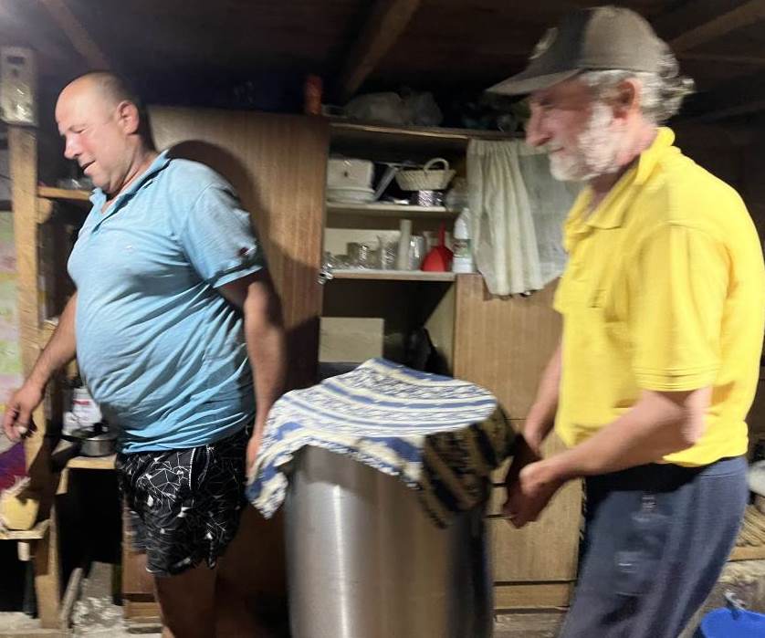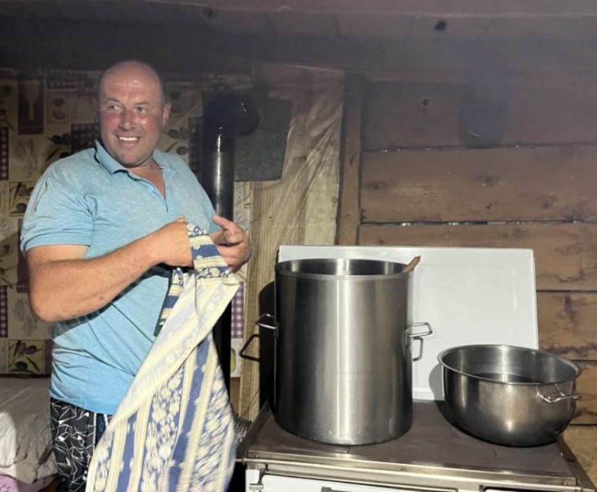 "Mlijeko procijedim,uspem u lonac da odstoji. Kad se počne siriti stavim ga na šporet da se zagrije jedno 15-ak minuta na oko 35 stepeni. Zatim ocijedim surutku, a sir ide na cijeđenje od jutra do uveče. Onda ga stavim u bačvu, pa poslije jedno četiri dana ide u mješinu gdje stoji minimum mjesec i po dana", pojašnjava domaćin dok sipa na degustaciju i svoju domaću rakiju.