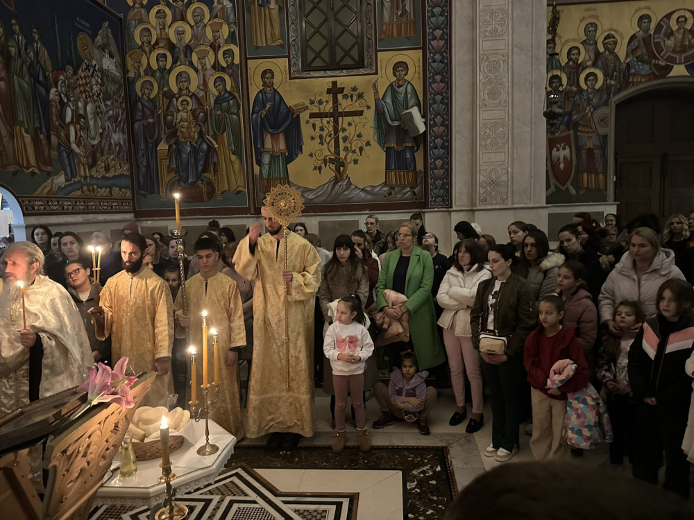 Liturgiju je služio vladika zahumsko-hercegovački i primotski Dimitrije, a prisustvovala su djeca koja će večeras plivati za časni krst u zatvorenom olimpijskom bazenu, kao i brojni vjernici.