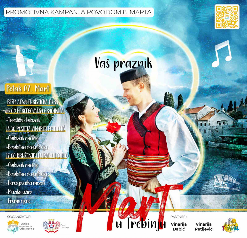 Povodom 8. marta - Međunarodnog dana žena Turistička organizacija Grada Trebinja uz partnerstvo turističke agencije „Lux Travel“ i vinskih podruma „Petijević“ i „Dabić“ organizuje promo akciju „VAŠ PRAZNIK U TREBINJU“.