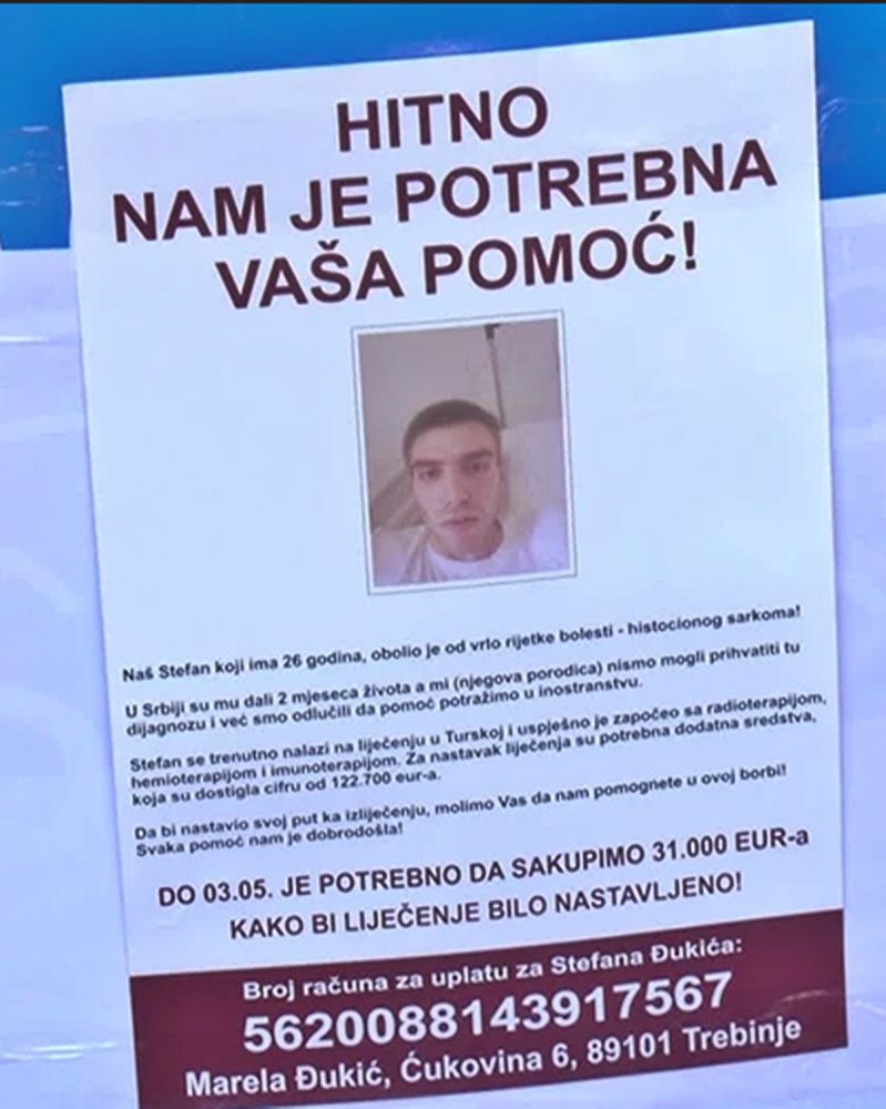 Oticanje koljena, pogrešna terapija, pa dijagnoza rijetke i teške vrste tumora. Mladom Trebinjcu Stefanu Đukiću prije dvije godine stigla je dijagnoza histiocidnog sarkoma, od kojeg oboli jedna od milion osoba na svijetu. Šanse za liječenje u Srbiji su bile male, ljekaru su mu prognozirali dva mjeseca života. Ali nada je stigla iz Turske, gdje je trenutno na liječenju.