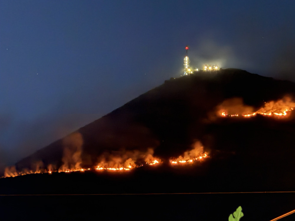 Fotografija prikazuje trenutno stanje na terenu gdje se plameni jezici protežu duž padina Leotara, stvarajući dramatičan i zabrinjavajući prizor