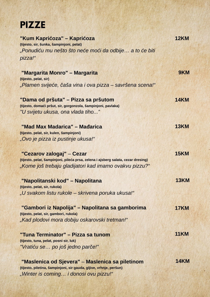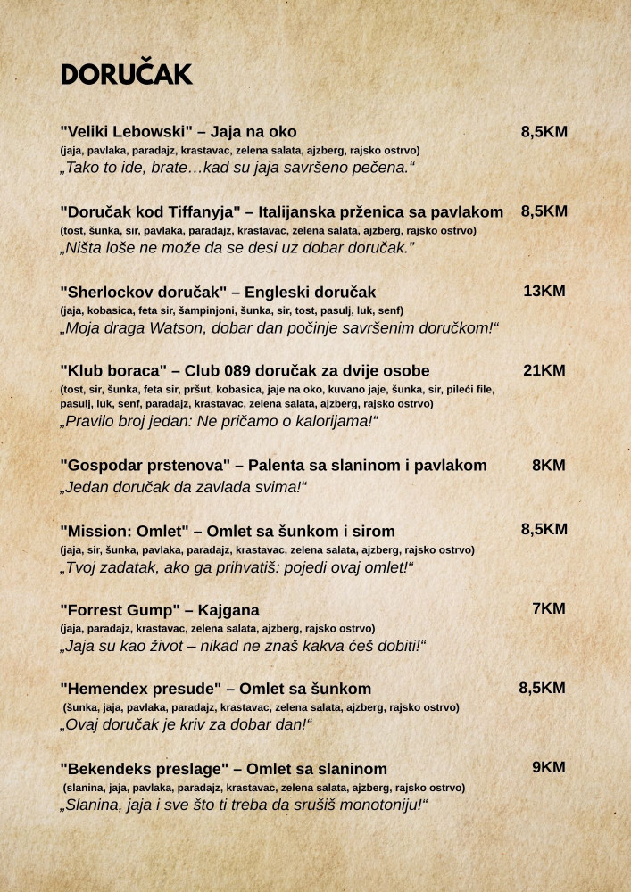 Caffe pizzeria "Club 089" predstavila je jedinstveni meni inspirisan najpoznatijim filmskim naslovima. Svako jelo nosi ime po kultnom filmu, uz duhovit citat koji gostima garantuje osmijeh prije nego što probaju zalogaj.